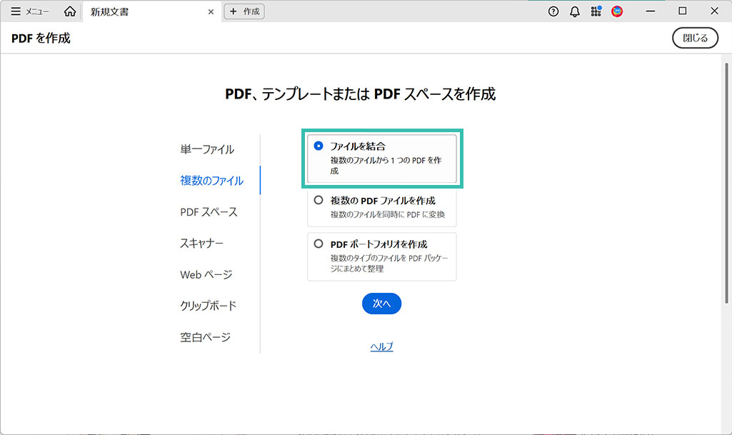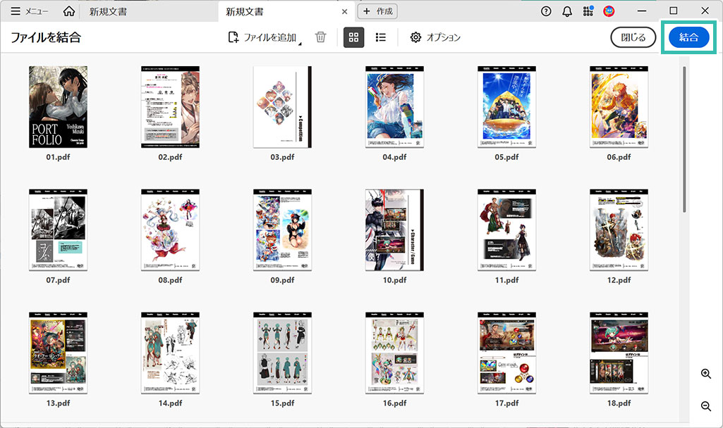 それではバラバラのPDFやJPEG・PNG等のファイルを1つのPDFにまとめてポートフォリオに仕上げていきましょう。