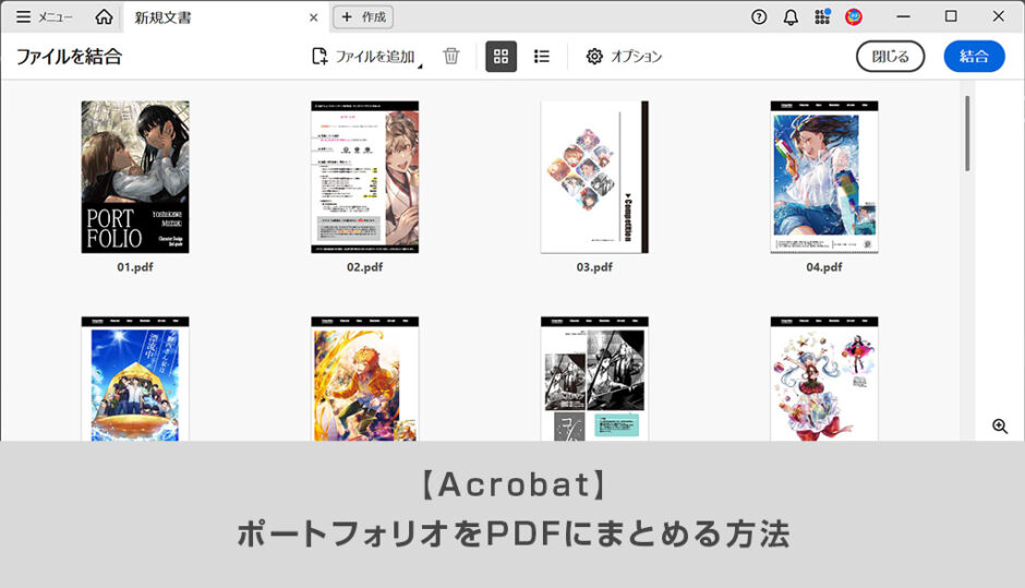 以上、Acrobat(アクロバット)を使って単ページの素材を1つのPDFにまとめてポートフォリオに仕上げる方法についてでした。Acrobatは単にページをまとめるだけでなく、ページの並び順の変更、ページの追加・削除も簡単に行えます。