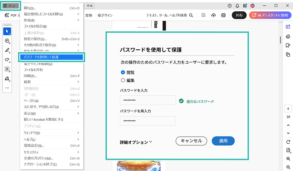 Acrobat画面左上の [ メニュー ] → [ パスワードを使用して保護 ] をクリック。パスワードを使用して保護の画面が開くので、[ 閲覧 ] にチェックを入れ、任意のパスワードを設定後に [ 適用 ] をクリックしたら完了です。
