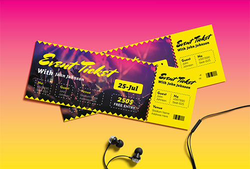 イベント会場等への入館に必要なチケットのデザイン、そしてデザインをはめ込んでさも本当に印刷したチケットのような表現ができるモックアップの素材です。