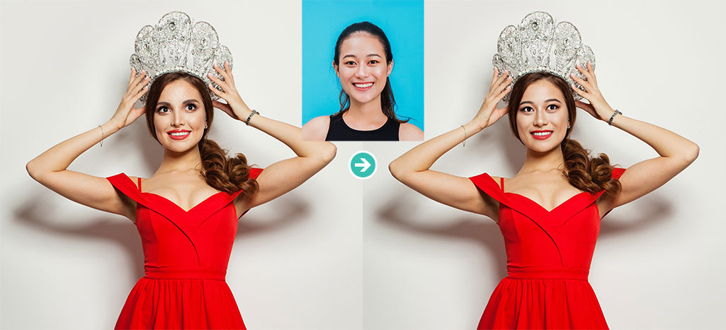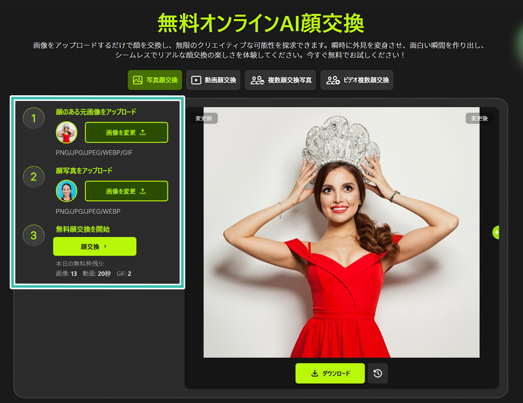 動画コンテンツも静止画と同じ使い方でできます。顔のある動画、変更したい顔画像をアップロードし、顔交換をクリックするだけで簡単に別人にする事ができますよ!
