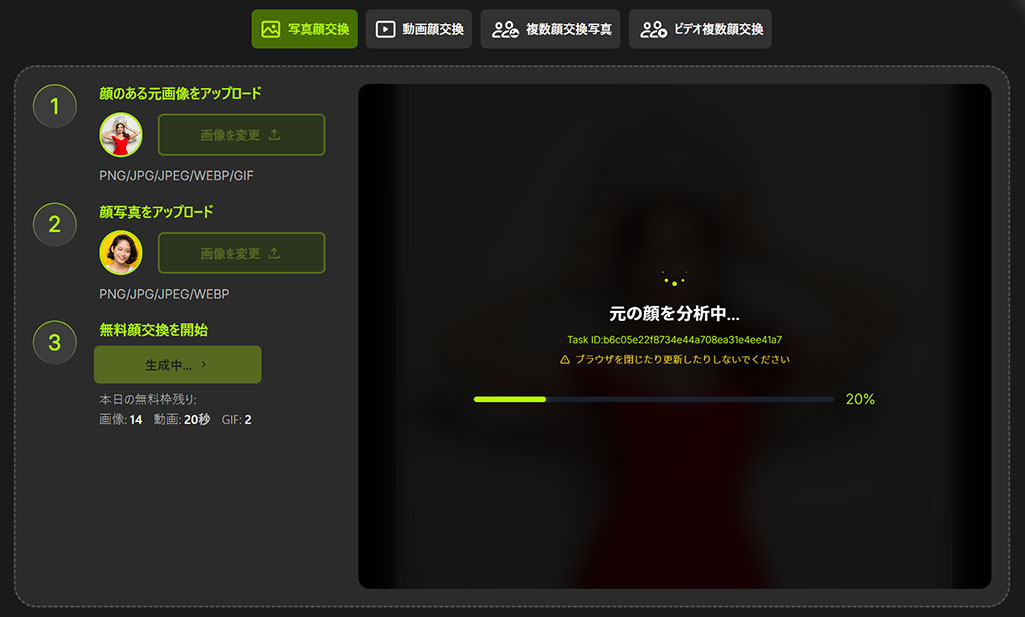 [ 顔のある元画像をアップロード ] をクリックするとベースとなる画像が選択できます。[ 顔写真をアップロード ] をクリックすると交換したい顔画像が選択できます。