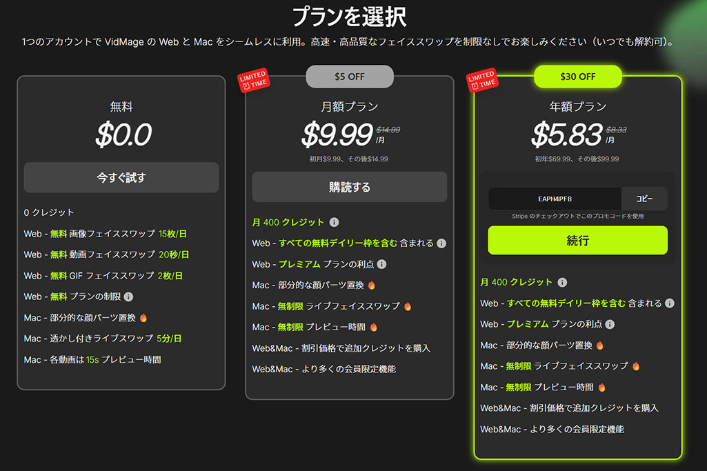 VidMage利用のプラン一覧です。無料で十分過ぎる内容ですが、有料プランにアップグレードすると更に使える機能が増えて高速・高品質なフェイススワップが実現できます。