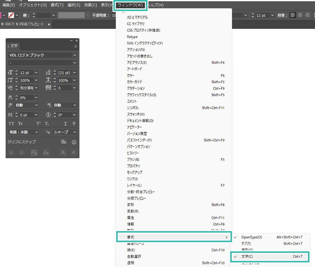 ※非表示の場合は [ ウィンドウ ] → [ 書式 ] → [ 文字 ] で表示可。