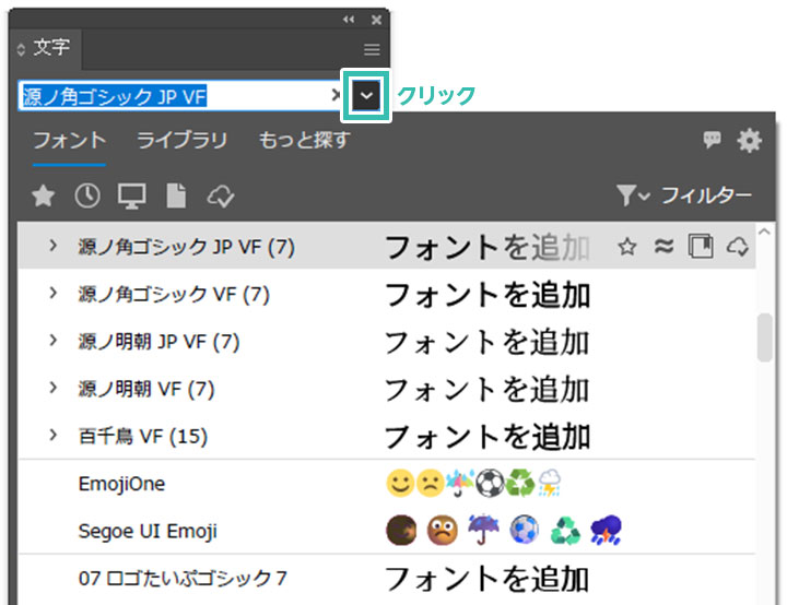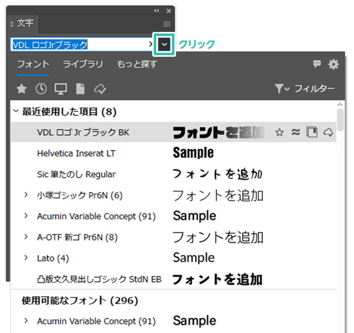 Illustratorを開き、文字パネルの [ フォントファミリを設定 ] 右側にある矢印をクリックすると追加したフォントが確認できます。