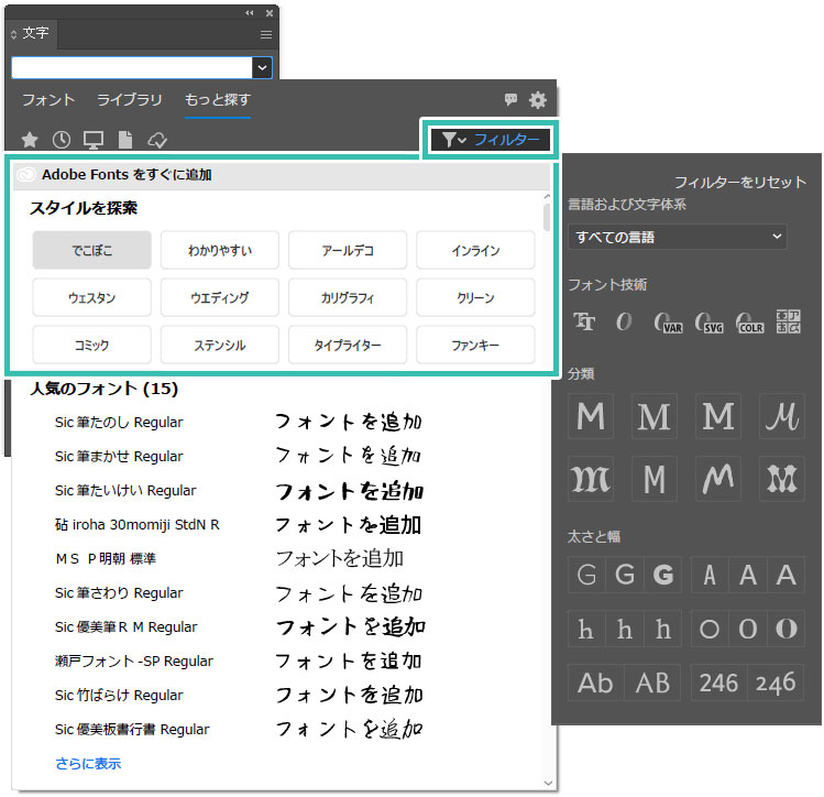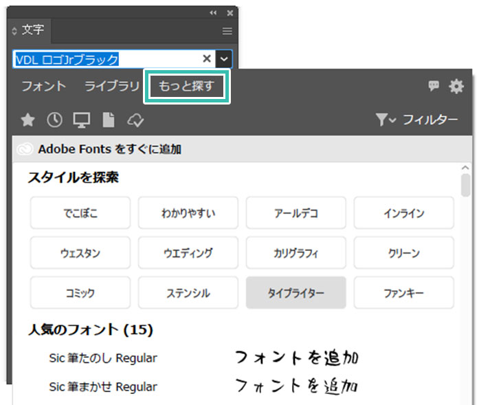 [ もっと探す ] のタブをクリックするとAdobeFontsから使用可能なフォントを表示できます。