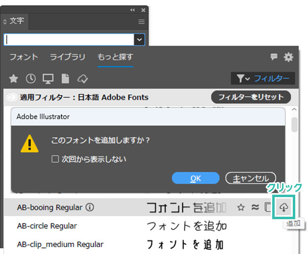 使いたいフォントが見つかったら右端のメニュー内に [ 追加 ] のクラウドアイコンがあるのでクリックしましょう。「このフォントを追加しますか?」が表示されるので [ OK ] をクリック。