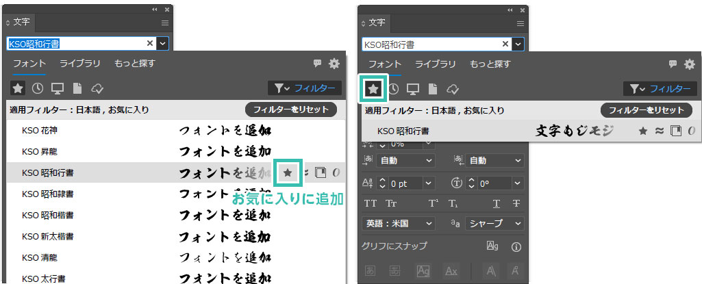 よく使うフォントは星形アイコンをクリックすると [ お気に入りに追加 ] する事ができます。[ お気に入りのフォントを表示 ] をクリックするとお気に入りフォント一覧が表示されますよ。