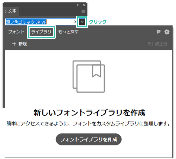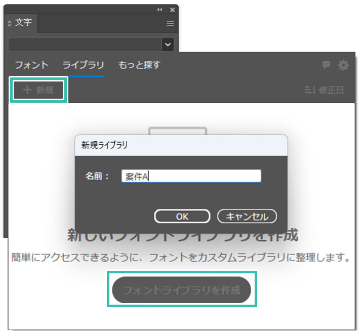 [ 新規 ] または [ フォントライブラリを作成 ] をクリックすると新規ライブラリの作成ができます。お好きな名称を入力して [ OK ] をクリックしましょう。