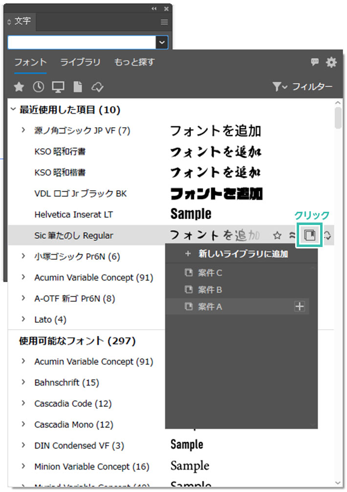 [ フォント ] のタブをクリックし、[ ライブラリに追加 ] をクリックすると指定のライブラリ内に登録できます。