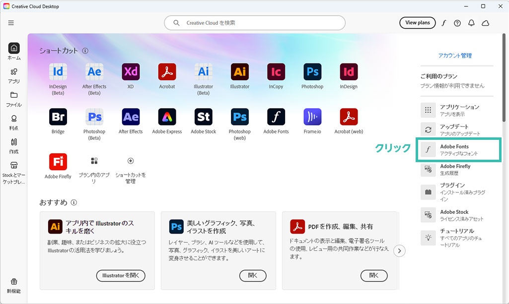 [ Creative Cloud Desktop ] を起動します。アプリ右メニュー内にある [ Adobe Fonts ] をクリックしましょう。
