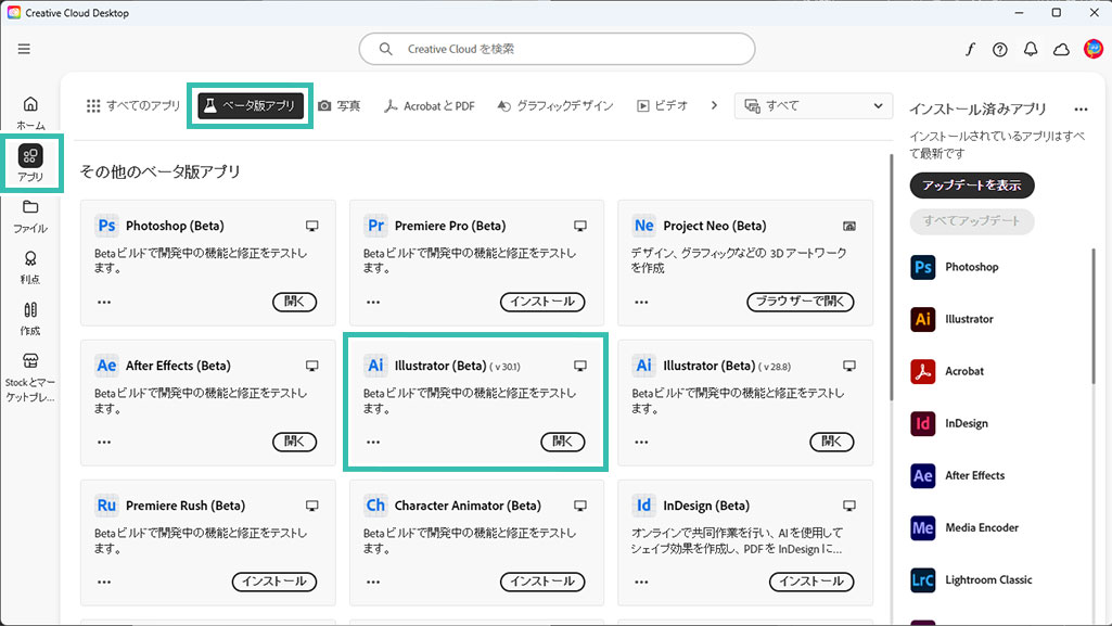 左メニュー内の [ アプリ ] をクリック後、上部タブメニュー内の [ ベータ版アプリ ] をクリックすると各種ベータ版のAdobe製品が表示されます。