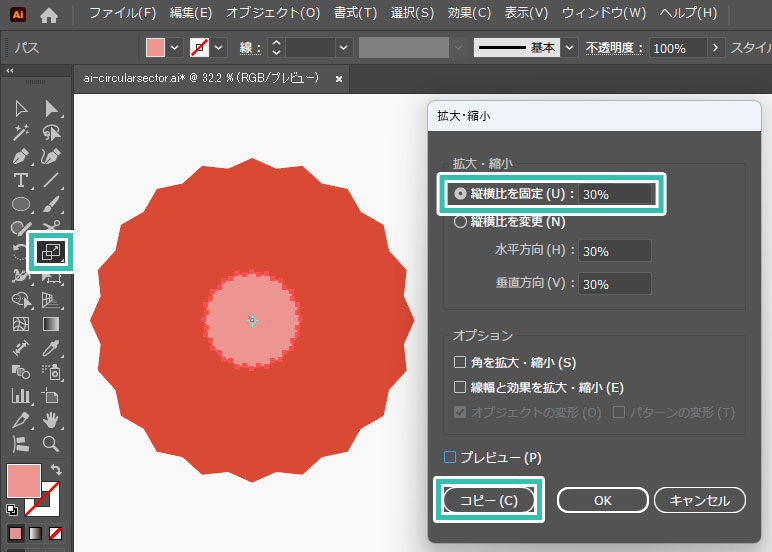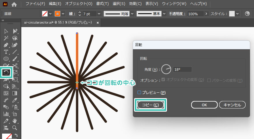 設定後は [ コピー ] をし、直後に [ Ctrl + D ] (Mac:⌘ + D) で変形の繰り返しを行います。