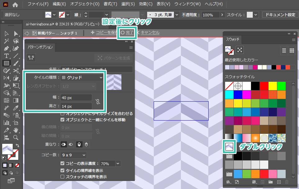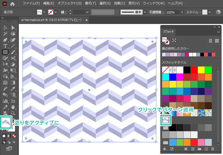 ヘリンボーンパターンをスウォッチにパターンとして登録・適用・編集する方法を解説します。