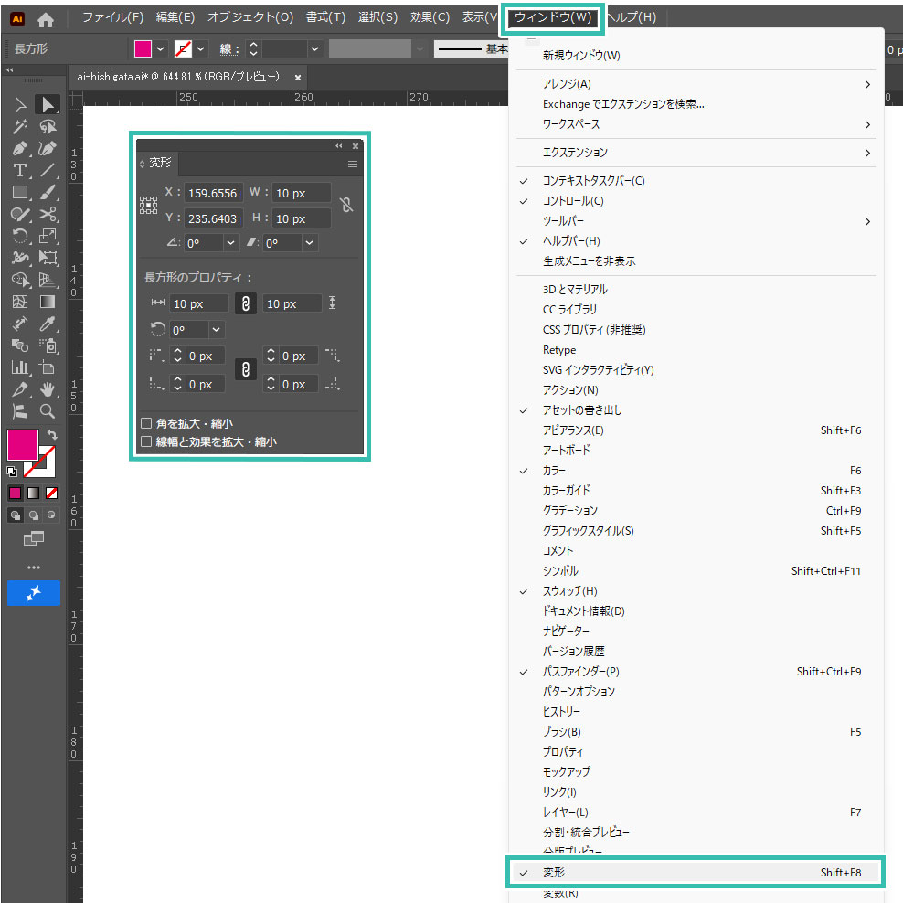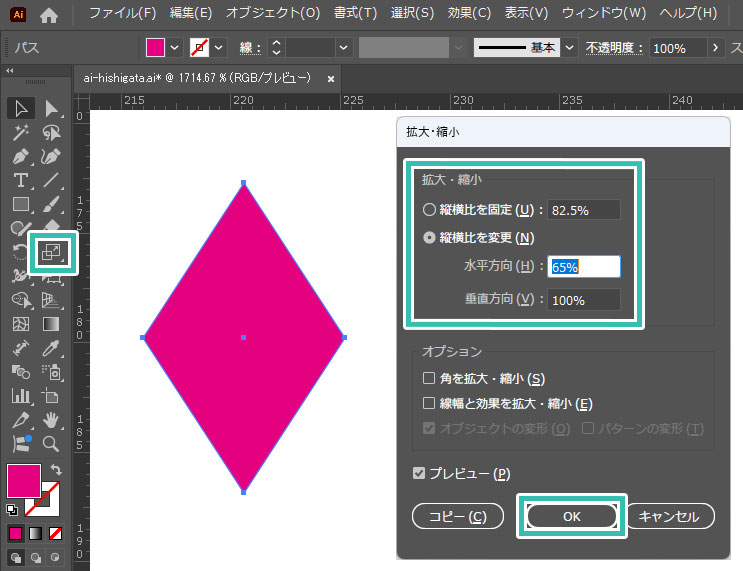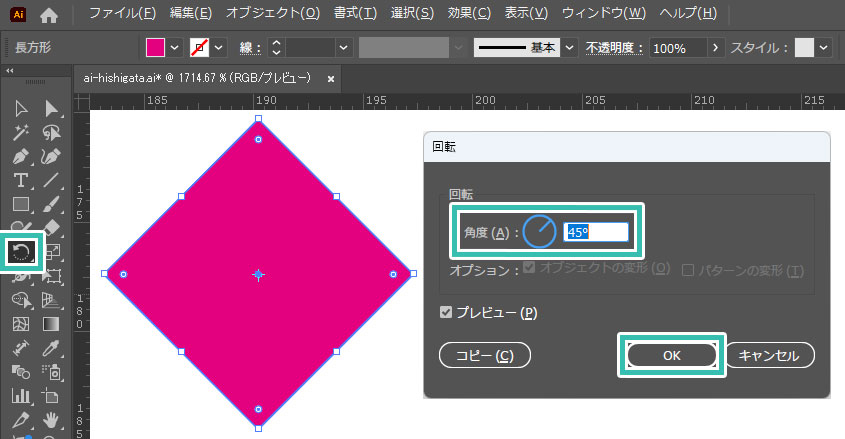 拡大・縮小ツール、変形パネル、アピアラスの変形を使えば正方形オブジェクトを簡単に菱形にする事ができます。