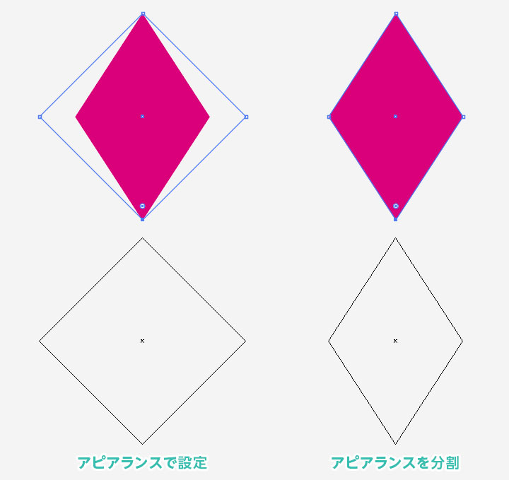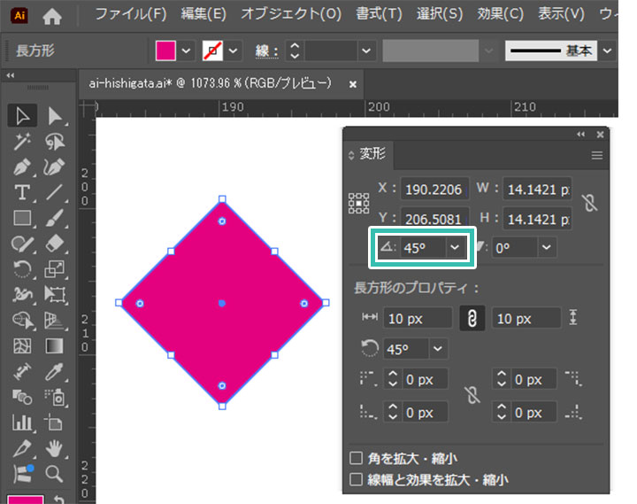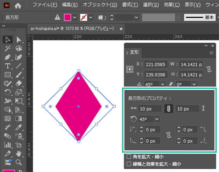 また、アピアランスで変形させると [ 長方形のプロパティ ] が維持したまま菱型にできます。角丸の菱形といった複雑なオブジェクトが作れるので是非お試しください。