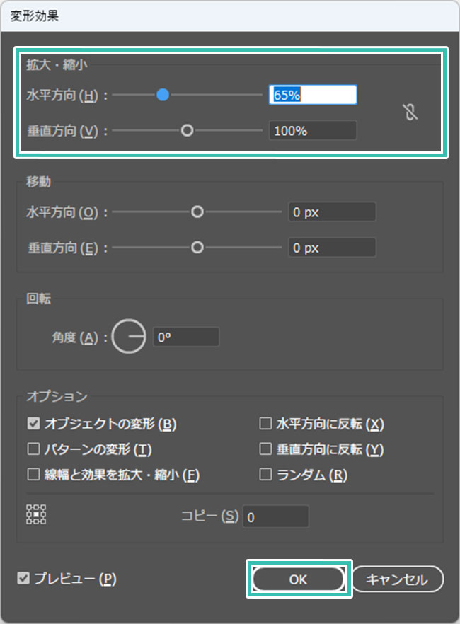 水平・垂直方向の拡縮率が後から正確に変更できる利点があります。