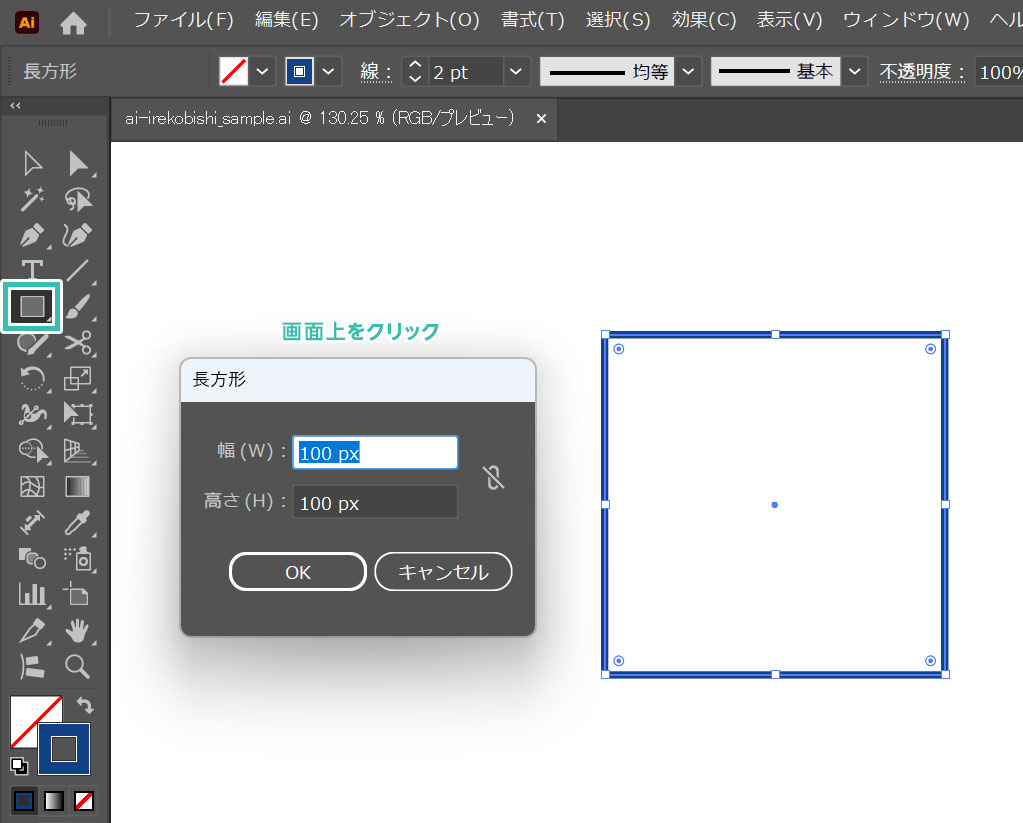 [ 長方形ツール ] で画面をクリックし、下記サイズの正方形を作成しましょう。