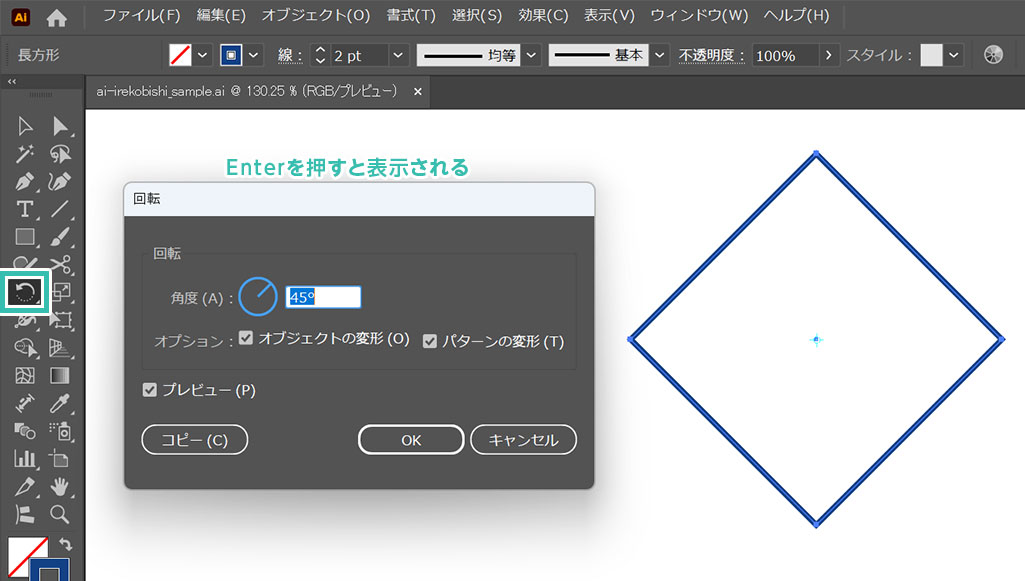 正方形を選択後、[ 回転ツール ] → [ Enter ] を押して回転のダイアログ画面を開きます。