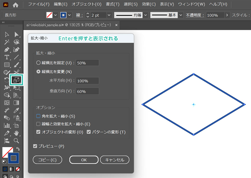 拡大・縮小ツールでひし形に変形