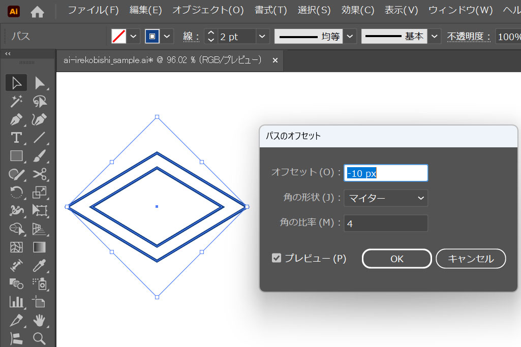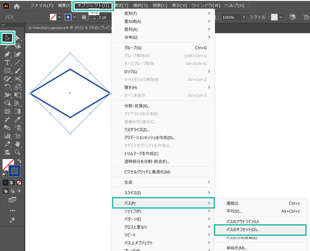 菱形オブジェクトを選択し、[ オブジェクト ] → [ パス ] → [ パスのオフセット ] をクリックします。