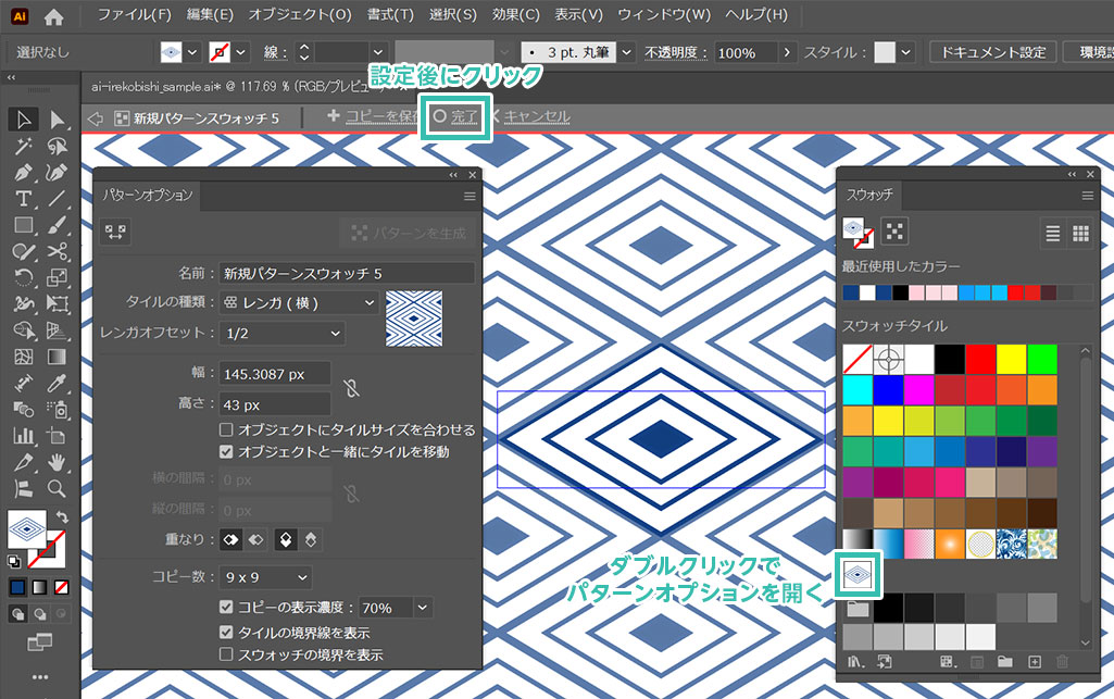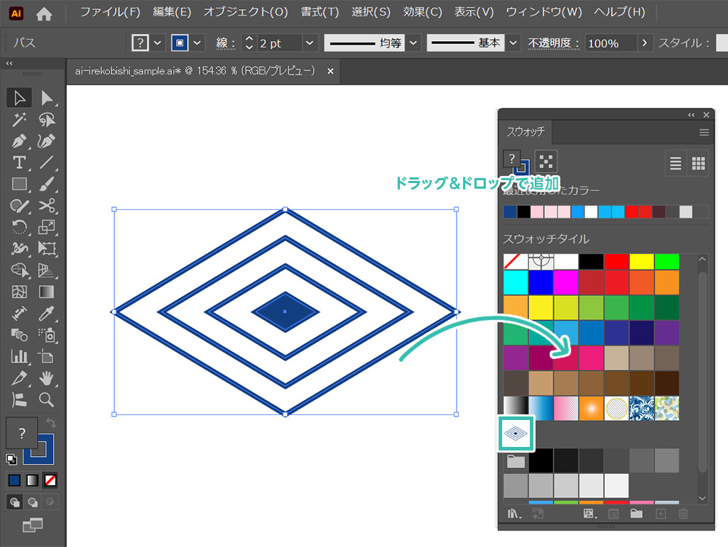 入子菱のベースパターンオブジェクトを [ 選択ツール ] で選択し、スウォッチパネル内へドラッグ&ドロップするとパターンとして登録できます。
