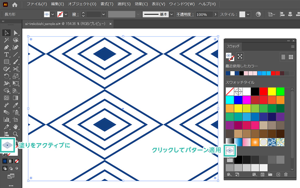 [ 長方形ツール ] でパターンを適用したいオブジェクトを作成し、スウォッチ内の入子菱パターンをクリックして適用しましょう。