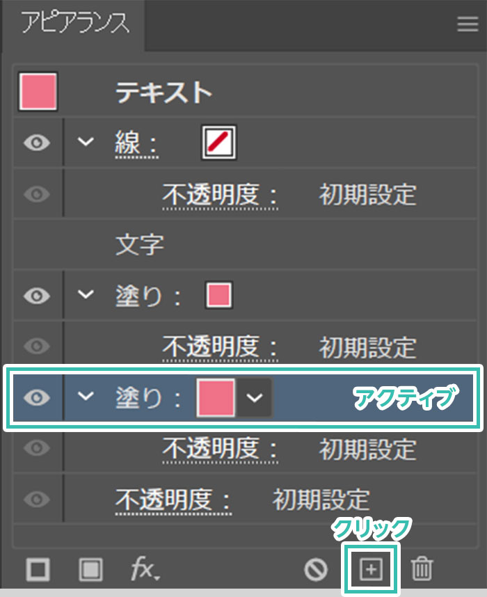 塗りをクリック後、右下の [ + ] をクリックして選択した項目を複製しましょう。複製したら下部の項目をアクティブにします。