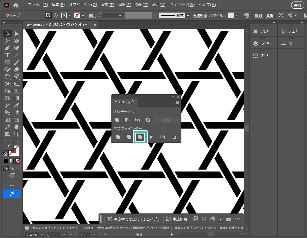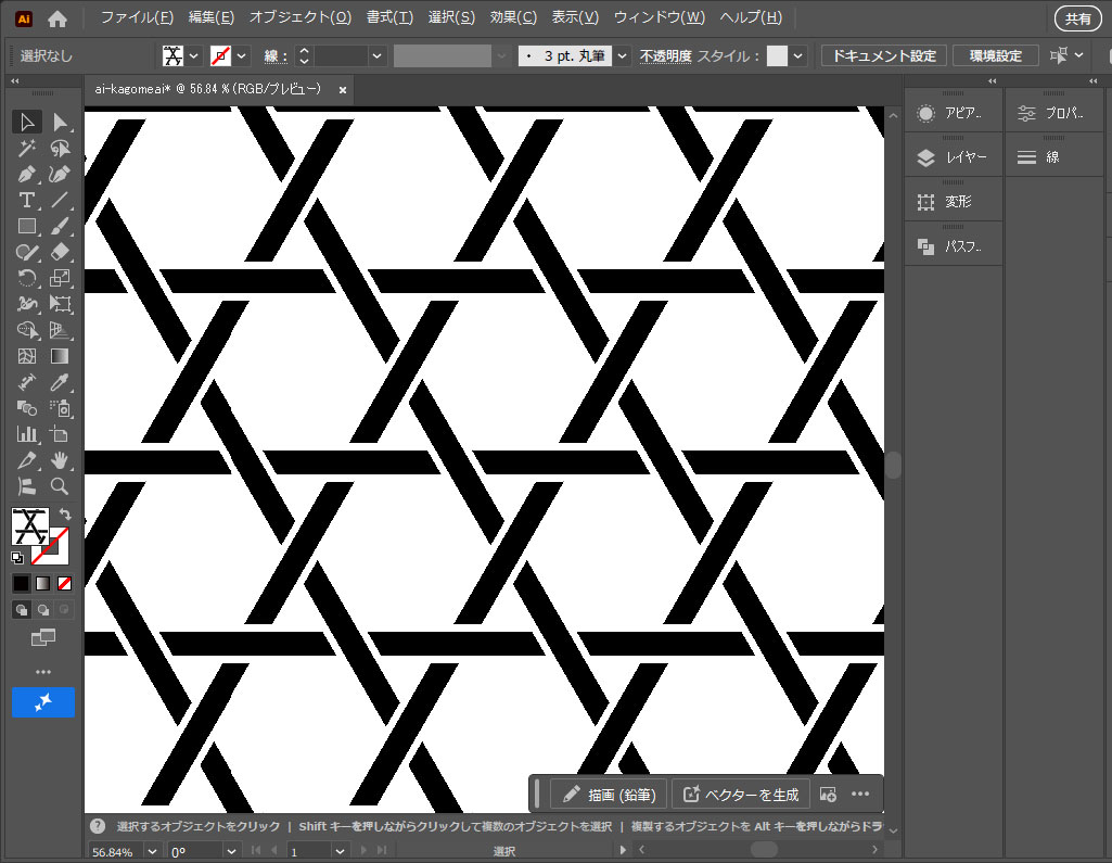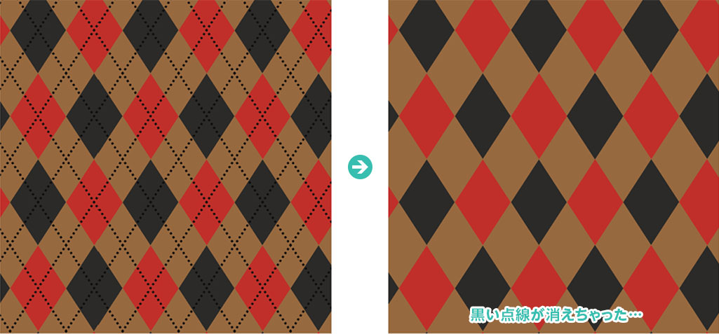 単色のシンプルなパターンには有効的ですが、少し複雑なパターンに合流を適用すると柄が変わってしまう事があります。全てのパターンをバラして結合するのはかなりの手間なので、JPEGやPNG等の画像に書き出してしまうのが一番手っ取り早くて確実です。(オブジェクト単位でサクッと画像に書き出す方法はコチラの記事で解説しています。)