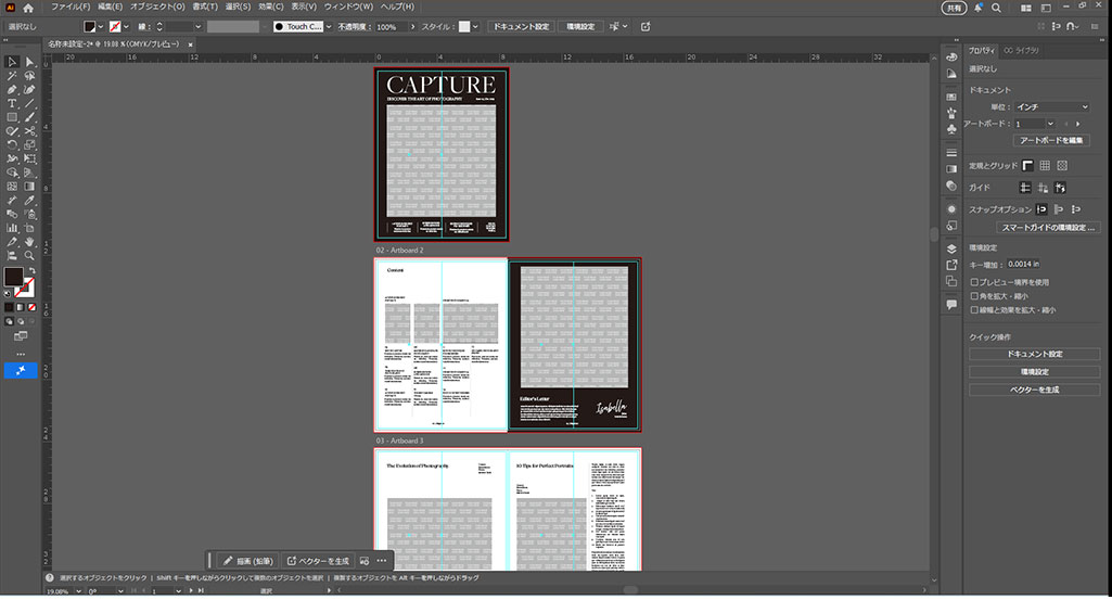 サンプルはIllustrator用ポートフォリオテンプレートの [ Photography Magazine Template ] を活用しました。あとは画像と文字を差し替えるだけですよ。