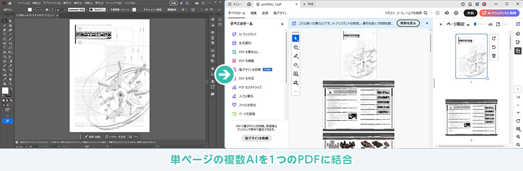 Illustratorを使った場合、1つのAIファイル内に複数のアートボードを設定する事でAcrobatを使わず複数ページのPDFを作成する事ができます。ページ数や画質、デザインによってファイルが重くなる可能性がありますが、一回の書き出しでPDFポートフォリオの作成が可能です。