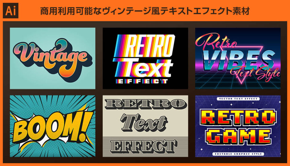 以上、アドビIllustratorで活用できるヴィンテージな雰囲気のテキストエフェクト素材についてでした。全て商用利用可能なAI形式の素材なのでそのままロゴやバナー、チラシ等、様々なコンテンツに使えます。