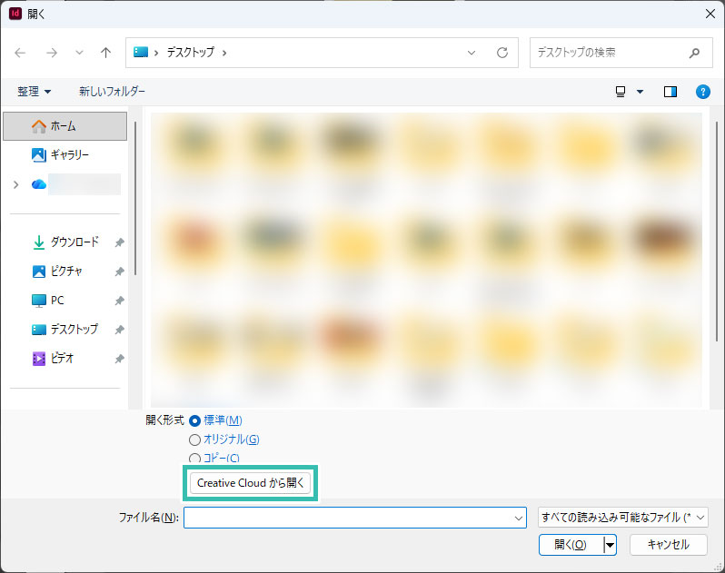 InDesign画面左上の [ ファイル ] → [ 開く ] または [ Ctrl + O ] (Mac: + O) で [ 開く ] のダイアログ画面が表示されます。