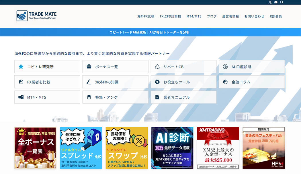 TRADE MATEは、海外在住のFX利用者に向けて、FXに関する情報を発信するWebメディアであり、吉天有限公司によって運営されています。FXの海外口座に関する実践的な知識や、FXに関する最新かつ幅広い情報を届けるとともに、利用者が自分に合った投資プロバイダーを探すためのサポートを提供することを目的としています。