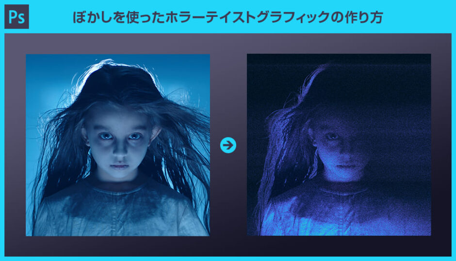 Photoshop(フォトショップ)のぼかし機能を使ったホラーテイストなグラフィックの作り方をフォトショ初心者の方に詳しく解説します。写真の一部が伸びたような不気味な表現にザラっとしたノイズ感などが付与できます。