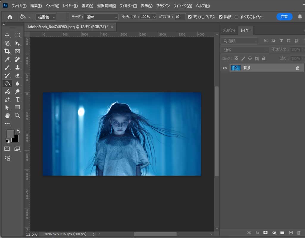 Photoshopで編集対象の画像を開きます。サンプルは [ Little caucasian girl in ghost ] を使用しました。
