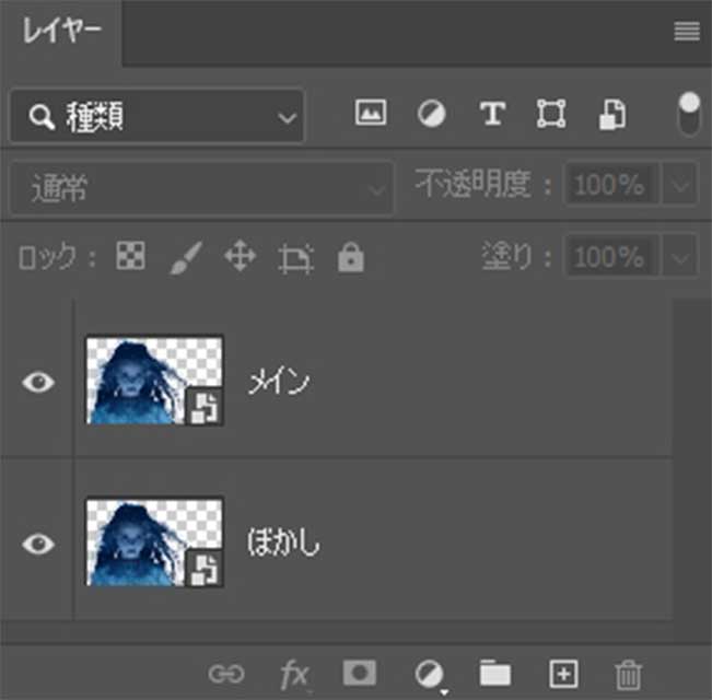 [ Ctrl + J ] (Mac: + J) でレイヤーをコピーし、レイヤー名を変更しましょう。サンプルは上から順に「メイン」、「ぼかし」としました。
