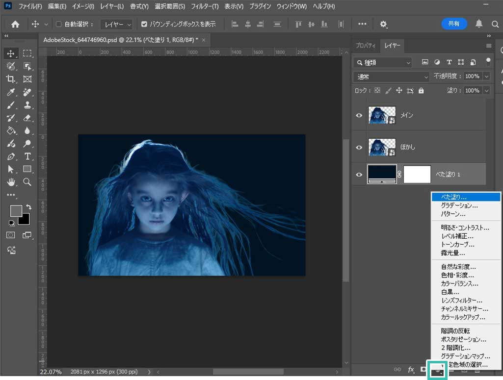 レイヤーパネル下部から [ 塗りつぶしまたは調整レイヤーを新規作成 ] → [ べた塗り ] を追加しましょう。