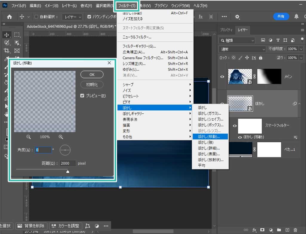 「ぼかし」のレイヤーにPhotoshop画面上部から [ フィルター ] → [ ぼかし ] → [ ぼかし(移動) ] を追加します。