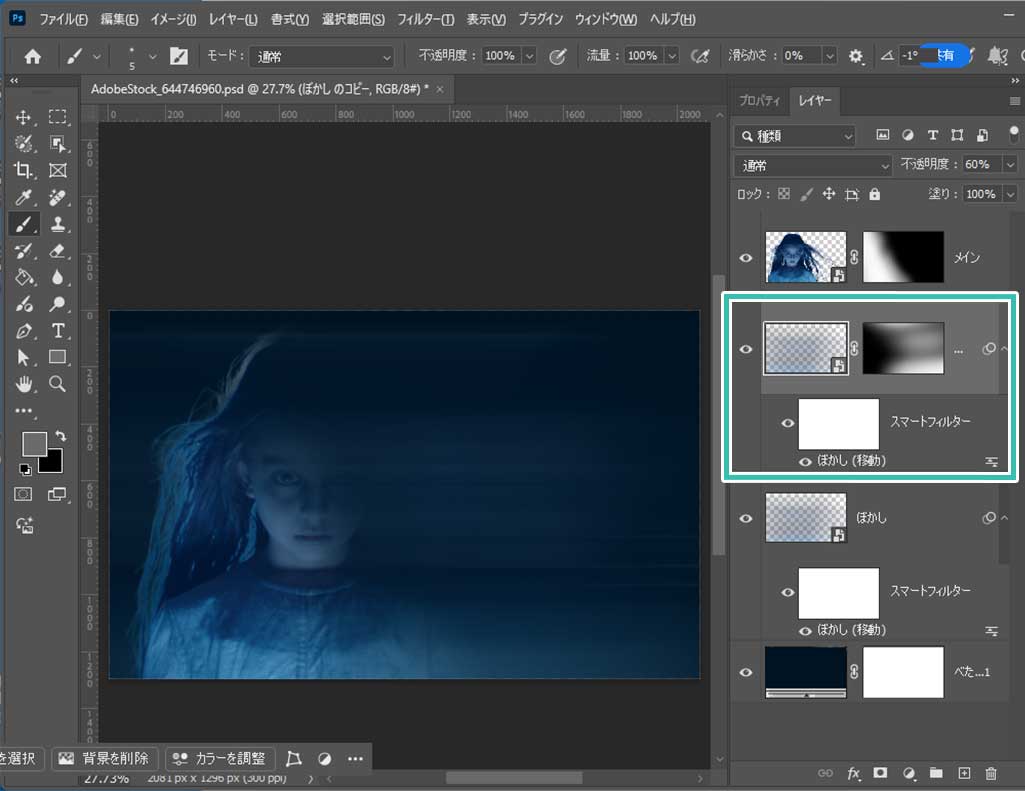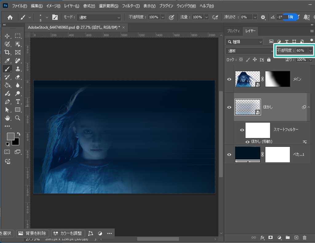 レイヤーの不透明度を60%に下げると左図の様に画像の一部が伸びたような表現ができました。以上でベースとなる画像の完成です。