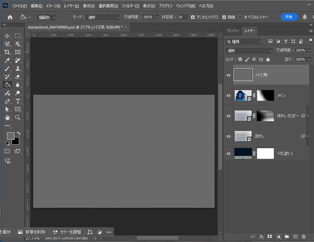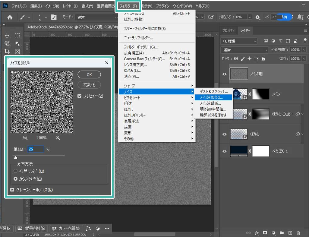 フォトショップ画面上部の [ フィルター ] → [ ノイズ ] → [ ノイズを加える ] を適用します。