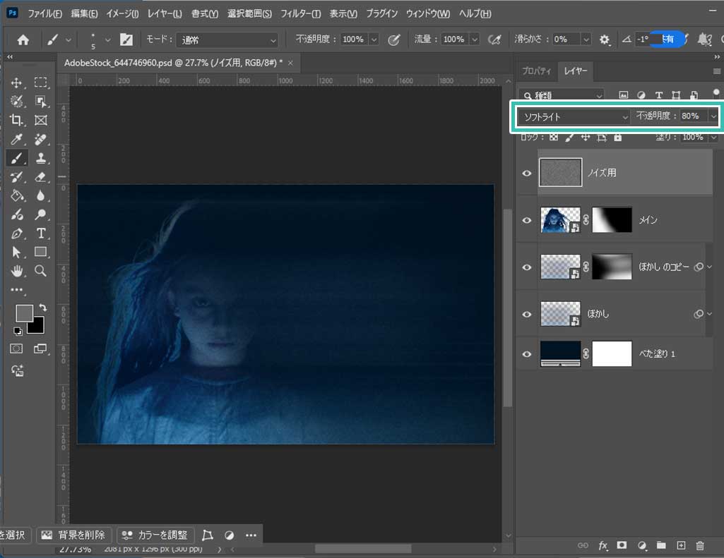 レイヤーの描画モードを [ スクリーン ] に変更します。不透明度は80%に変更しました。するとノイズテクスチャがいい感じで馴染みましたね。