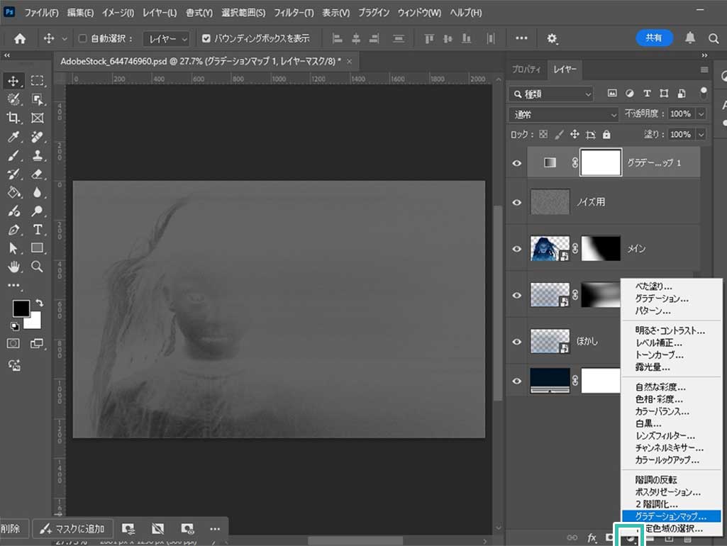 レイヤーパネル下部から [ 塗りつぶしまたは調整レイヤーを新規作成 ] → [ グラデーションマップ ] を追加します。