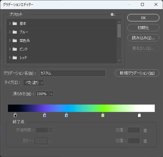 グラデーションエディターを編集します。サンプルは左から順に下記の色を設定しました。