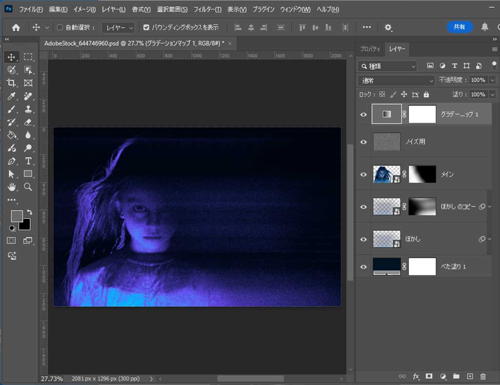 以上で簡単なホラー風表現の完成です。画像の一部が伸びた表現とざらつきのあるノイズ表現、グラデーションマップを使った色変更で不気味さの強調ができました。