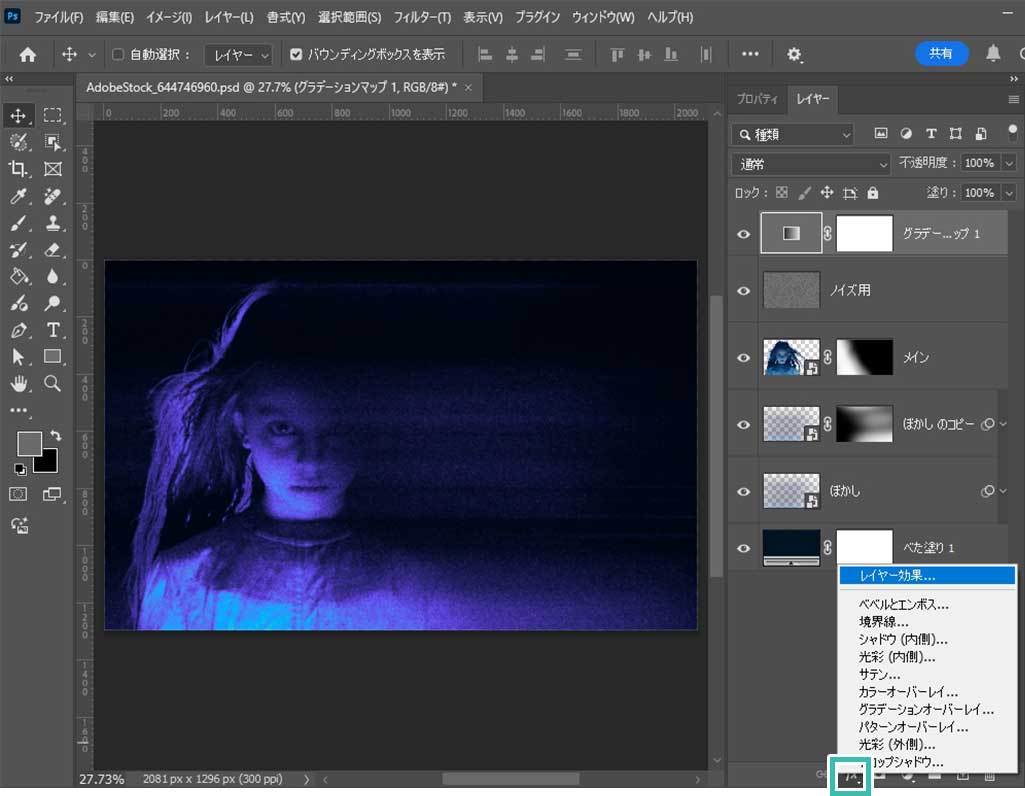 レイヤー下部から [ fx ] → [ レイヤー効果 ] クリックしましょう。