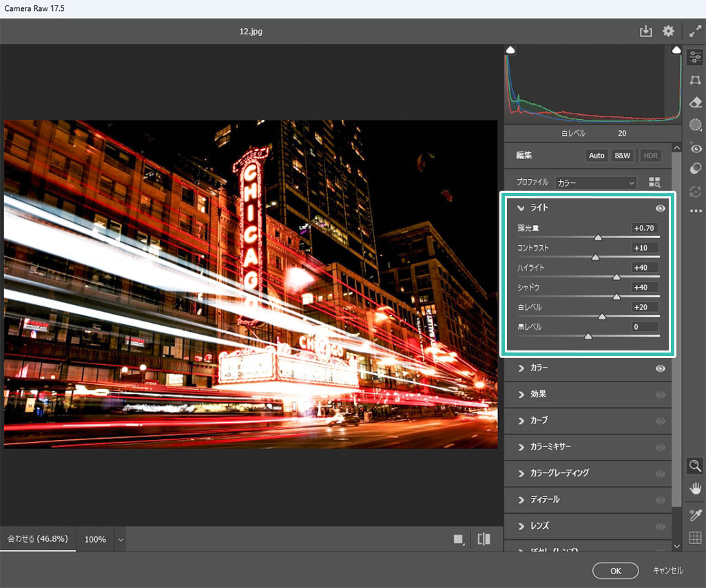 シャドウ:+40 白レベル:+20 黒レベル:0