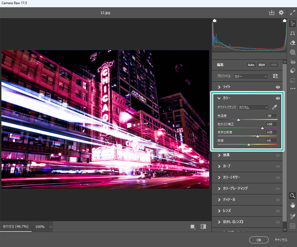 引き続きCamera Rawフィルターの [ カラー ] を設定します。