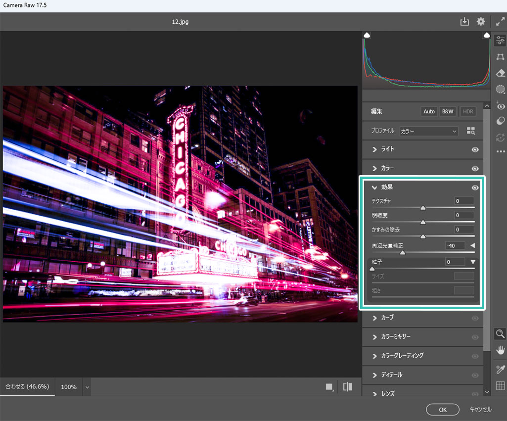 お好みでCamera Rawフィルターの [ 効果 ] を追加します。