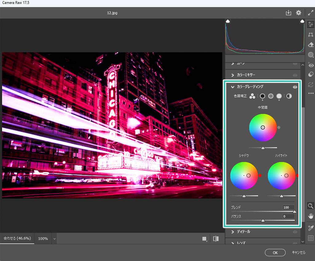 引き続きCamera Rawフィルターの [ カラーグレーディング ] を設定します。